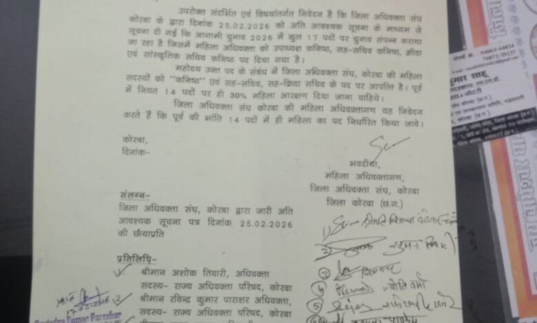 KORBA BAR ELECTION 2026: महिला आरक्षण पर विवाद… ‘कनिष्ठ’ पद को लेकर महिला वकीलों में आक्रोश, राज्य अधिवक्ता परिषद पहुंची शिकायत…