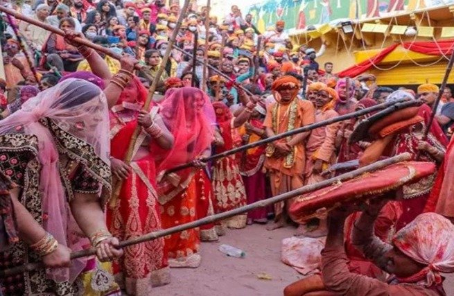 Barsana Lathmar Holi: मथुरा। मथुरा के बरसाना में बुधवार को अनोखा नजारा दिखा। चेहरे पर घूंघट, हाथ में लट्ठ और उनके सामने हाथों में ढाल लिए नंदगांव के हुरियारे। इसे देखने के लिए देश-विदेश से 20 लाख लोग मथुरा पहुंचे। नंदगांव से आए श्रीकृष्ण के सखाओं पर बरसाना की राधा बनी सखियों ने जमकर लाठी बरसाईं।