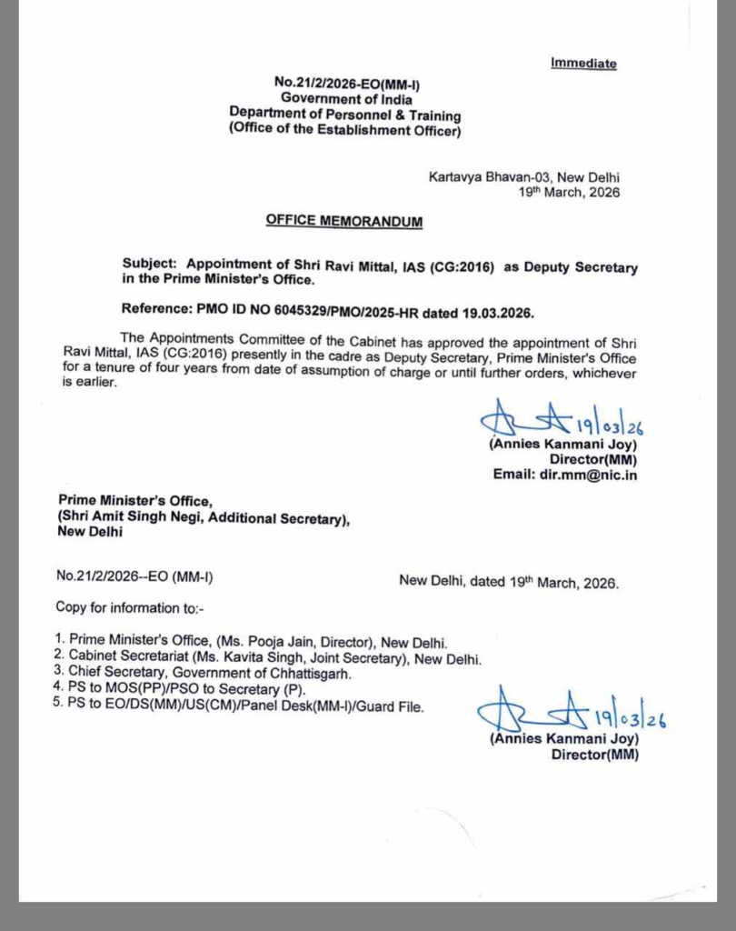 जारी आदेश के अनुसार, उनकी यह नियुक्ति केंद्र सरकार में प्रतिनियुक्ति के तहत की गई है। रवि मित्तल वर्तमान में छत्तीसगढ़ कैडर के अधिकारी हैं और प्रशासनिक कार्यों में उनका अनुभव महत्वपूर्ण माना जाता है।