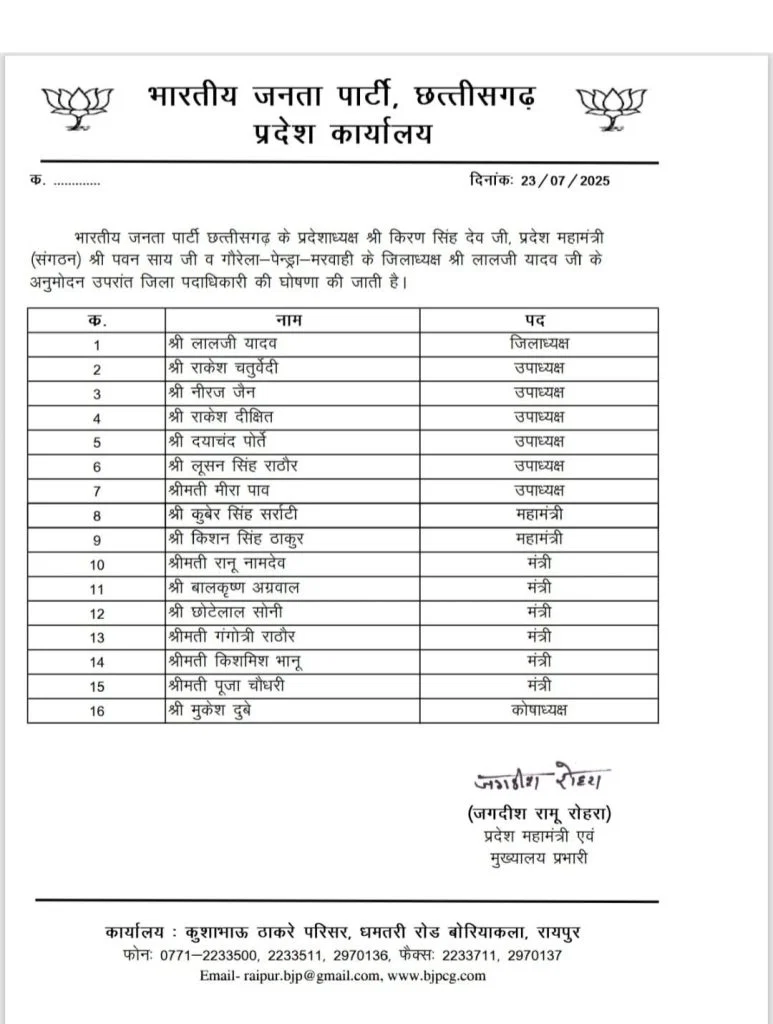 रायपुर, 23 जुलाई। BJP ने संगठनात्मक मजबूती और आगामी चुनावी तैयारियों को ध्यान में रखते हुए गौरेला-पेंड्रा-मरवाही जिले की नई जिला कार्यकारिणी की घोषणा कर दी है। कुल 16 कार्यकर्ताओं को संगठन में स्थान देकर उन्हें अहम जिम्मेदारियां सौंपी गई हैं।