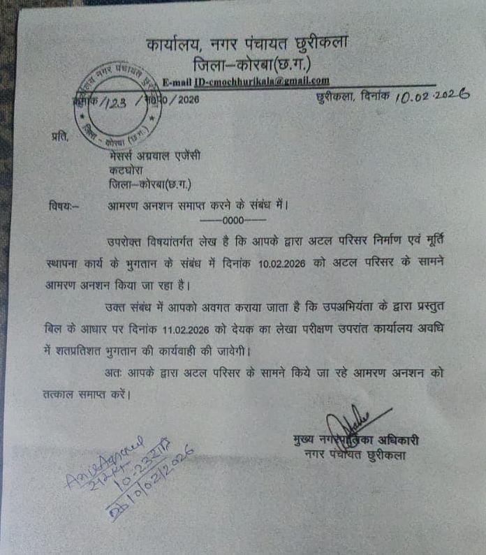 कटघोरा/छुरीकला। नगर पंचायत छुरीकला में अटल परिसर निर्माण और मूर्ति स्थापना का काम पूरा करने के बाद भी भुगतान के लिए भटक रहे ठेकेदार ने आखिरकार सड़कों पर उतरने का फैसला कर लिया। अपने ही हक की रकम के लिए परेशान ठेकेदार अनिल अग्रवाल 10 फरवरी से श्रद्धेय अटल बिहारी वाजपेयी की प्रतिमा के सामने आमरण अनशन पर बैठ गए।