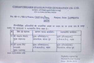 रायपुर |CSEB chemist transfer news छत्तीसगढ़ राज्य विद्युत उत्पादन कंपनी लिमिटेड (CSPGCL) ने प्रशासनिक आधार पर एक महत्वपूर्ण स्थानांतरण आदेश जारी किया है। कंपनी मुख्यालय द्वारा सोमवार को जारी आदेश के तहत दो वरिष्ठ अधिकारियों के कार्यक्षेत्र में बदलाव किया गया है।