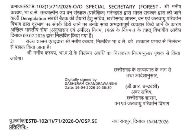 Manish Kashyap reinstated सरकारी आदेश के मुताबिक, पूर्व में हुई अनुशासनात्मक कार्रवाई के तहत उन्हें 9 फरवरी 2026 को निलंबित किया गया था। मामला उस समय सामने आया था जब केंद्र सरकार से जुड़ी एक महत्वपूर्ण बैठक की तैयारी के दौरान वरिष्ठ अधिकारियों के साथ व्यवहार को लेकर विवाद खड़ा हुआ था। इसी आधार पर अखिल भारतीय सेवा (अनुशासन एवं अपील) नियम, 1969 के तहत कार्रवाई की गई थी।अब नए आदेश में स्पष्ट किया गया है कि राज्य शासन ने तत्काल प्रभाव से मनीष कश्यप को बहाल कर दिया है। हालांकि, उनके निलंबन अवधि को लेकर अंतिम निर्णय नियमों के अनुसार अलग से किया जाएगा। आदेश छत्तीसगढ़ शासन वन एवं जलवायु परिवर्तन विभाग द्वारा जारी किया गया, जिस पर अवर सचिव डी.आर. चंद्रवंशी के डिजिटल हस्ताक्षर हैं।