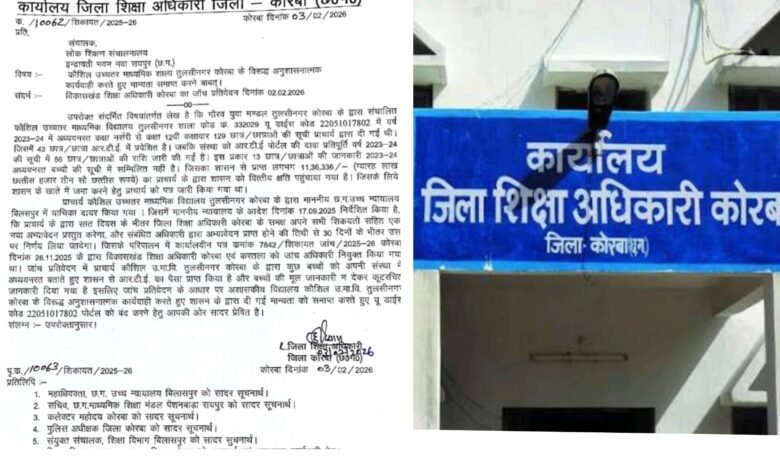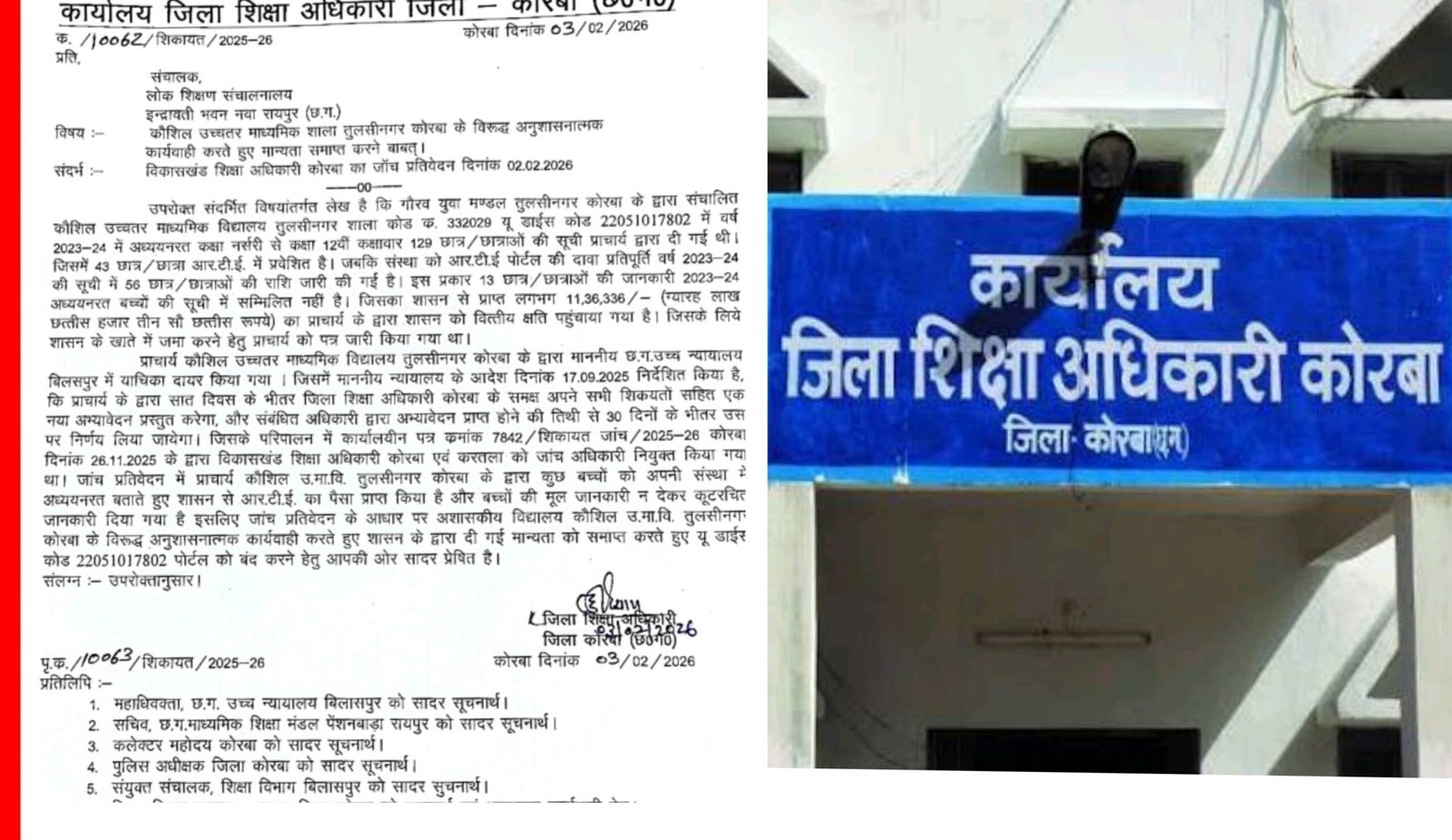 Breaking : कोरबा में आरटीई का बड़ा खेल उजागर: 129 छात्र दिखाकर लाखों निकाले, मान्यता रद्द करने की कार्रवाई शुरू..नियमों को दरकिनार कर राशि आहरित करने का आरोप, 11.36 लाख की क्षति… 3.27 लाख की वसूली के आदेश