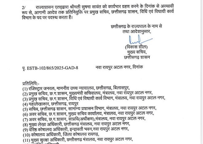 CG Breaking: Sushma Sawant appointed Principal Secretary, Law and Legislative