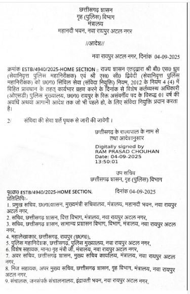 कोरबा। छत्तीसगढ़ शासन ने एक महत्वपूर्ण आदेश जारी करते हुए रिटायर्ड आईजी को एक वर्ष की संविदा नियुक्ति दी है। इस संबंध में शासन स्तर से आदेश जारी कर दिया गया है।