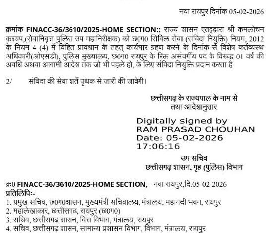 CG News: रायपुर। रिटायर्ड DIG कमलोचन कश्यप रायपुर PHQ में OSD बनाए गए हैं। गृह विभाग ने आदेश जारी कर बताया कि कमलोचन कश्यप, (सेवानिवृत्त पुलिस उप महानिरीक्षक) को छ0ग0 सिविल सेवा (संविदा नियुक्ति) नियम, 2012 के नियम 4 (4) में विहित प्रावधान के तहत् कार्यभार ग्रहण करने के दिनांक से विशेष कर्तव्यस्थ अधिकारी(ओएसडी), पुलिस मुख्यालय, छ0ग0 रायपुर के रिक्त असंवर्गीय पद के विरूद्ध 01 वर्ष की अवधि अथवा आगामी आदेश तक जो भी पहले हो, के लिए संविदा नियुक्ति प्रदान करता है।