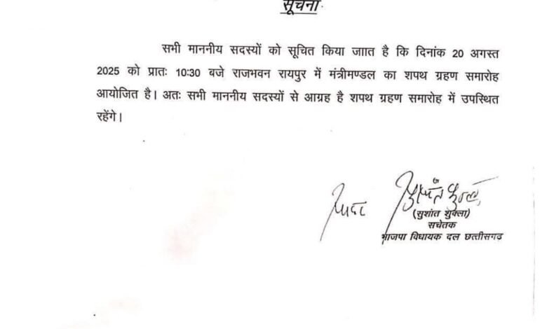 उनके अलावा अन्य मंत्री, BJP के विधायक भी इस समारोह में मौजूद होंगे। बतादें कि यहां पर लगभग तीन विधायक मंत्री पद की शपथ लेंगे। जिसमें अंबिकापुर विधायक राजेश अग्रवाल, आरंग विधायक गुरु खुशवंत, दुर्ग शहर विधायक गजेन्द्र यादव के नाम शामिल हैं।