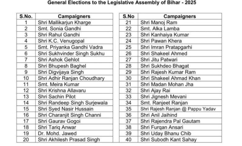 Bihar Election 2025: नई दिल्ली/पटना। Congress star campaigners list: बिहार विधानसभा चुनाव के पहले चरण को लेकर कांग्रेस ने अपने 40 स्टार प्रचारकों की सूची जारी कर दी है। इस सूची में पार्टी के शीर्ष नेतृत्व से लेकर युवा नेताओं तक को शामिल किया गया है।