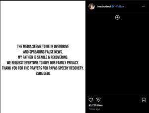 एशा ने लिखा, “मेरे पापा की तबीयत स्थिर है और वे रिकवरी कर रहे हैं। हम सभी से निवेदन करते हैं कि हमारे परिवार की प्राइवेसी का सम्मान करें। पापा की जल्दी ठीक होने की दुआओं के लिए आप सभी का धन्यवाद।”
