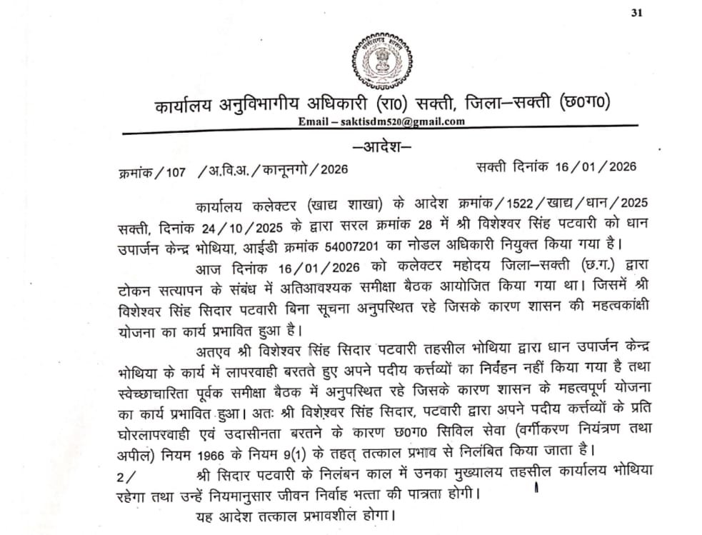 तहसील भोथिया के धान उपार्जन केंद्र के नोडल अधिकारी विशेश्वर सिंह सिदार को 16 जनवरी को आयोजित टोकन सत्यापन समीक्षा बैठक में बिना पूर्व सूचना अनुपस्थित पाए जाने पर तत्काल प्रभाव से निलंबित किया गया है। आदेश में उल्लेख है कि उनकी अनुपस्थिति और कार्य में लापरवाही से शासन की धान खरीदी योजना प्रभावित हुई है। निलंबन अवधि में उनका मुख्यालय तहसील भोथिया निर्धारित किया गया है तथा उन्हें नियमानुसार जीवन निर्वाह भत्ता देय होगा। यह कार्रवाई छत्तीसगढ़ सिविल सेवा नियम 1966 के नियम 9(1) के तहत की गई है।