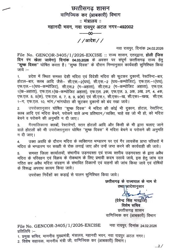 रायपुर, 24 फरवरी। Dry Day on Holi : छत्तीसगढ़ सरकार ने होली पर्व को देखते हुए 4 मार्च को पूरे राज्य में शुष्क दिवस घोषित किया है। इस संबंध में आबकारी विभाग ने आदेश जारी कर दिया है। आदेश के अनुसार, जिस दिन रंग खेला जाएगा यानी 4 मार्च को संपूर्ण राज्य में शराब बिक्री और परोसने पर पूर्ण प्रतिबंध रहेगा।
