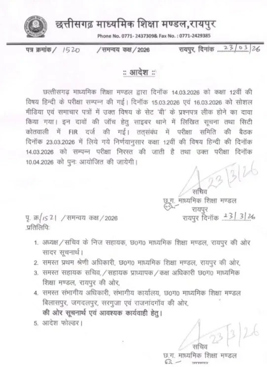 रायपुर, 23 मार्च। Exam Update : छत्तीसगढ़ में 12वीं बोर्ड परीक्षा को लेकर बड़ा फैसला लिया गया है। हिंदी विषय की 14 मार्च को आयोजित परीक्षा को प्रश्न पत्र लीक होने के कारण निरस्त कर दिया गया है।