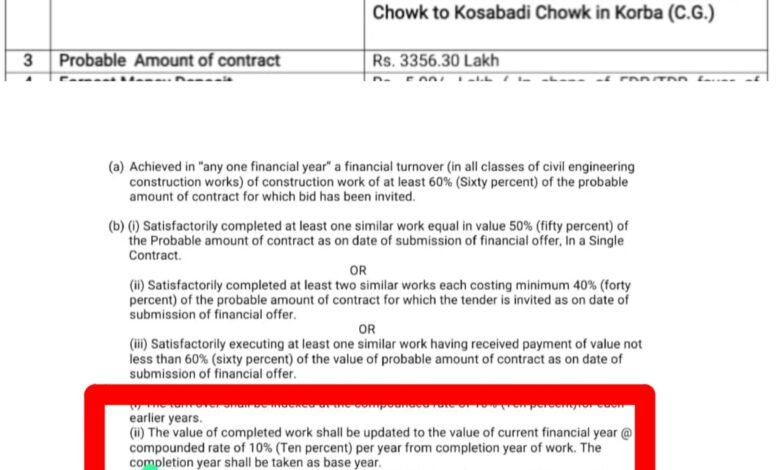 Korba Nagar Nigam Tenderदरअसल, सीएसईबी चौक से जैन चौक, आईटीआई चौक होते हुए कोसाबाड़ी चौक तक बनने वाली इस सड़क परियोजना के लिए करीब 3356.30 लाख रुपये की ऑनलाइन निविदा जारी की गई है। कागज़ों में यह शहर के विकास की बड़ी पहल है, लेकिन टेंडर की शर्तें पढ़ते ही पूरा खेल समझ में आने लगता है।