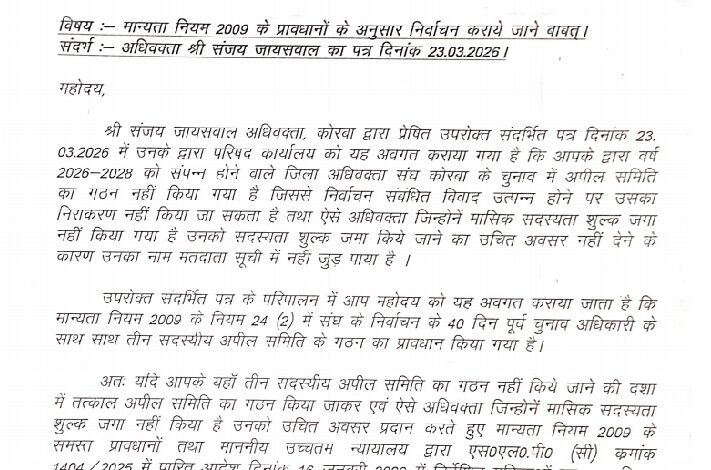 23 मार्च 2026 को जारी पत्र में परिषद ने स्पष्ट किया है कि मान्यता नियम 2009 के तहत चुनाव कराना अनिवार्य है, लेकिन कोरबा में कई अहम प्रक्रियाओं का पालन नहीं किया गया।
