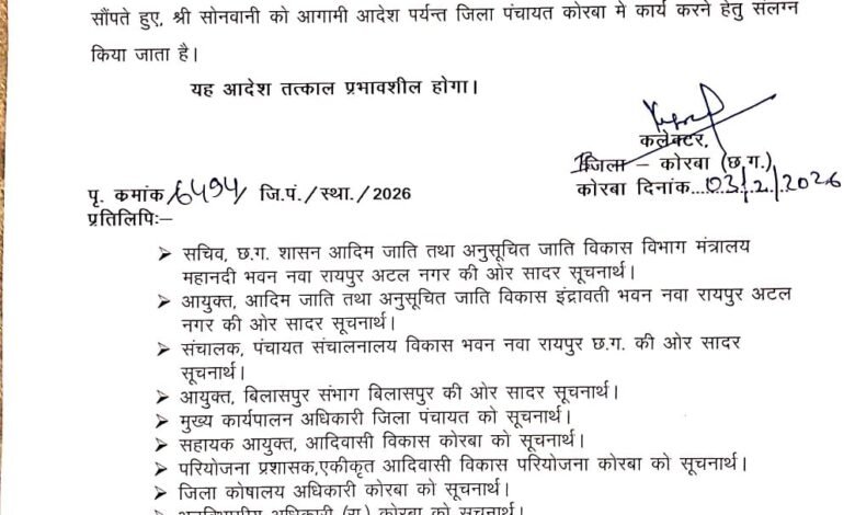 प्रशासनिक कामकाज प्रभावित न हो, इसके लिए जिला पंचायत कोरबा में पदस्थ सहायक परियोजना अधिकारी मोहनिश आनंद देवांगन को आगामी आदेश तक जनपद पंचायत पाली के CEO का अस्थायी प्रभार सौंपा गया है। वहीं भूपेंद्र कुमार सोनवानी को अगले आदेश तक जिला पंचायत कोरबा में संलग्न किया गया है। कलेक्टर ने साफ किया है कि यह आदेश तत्काल प्रभावशील होगा।