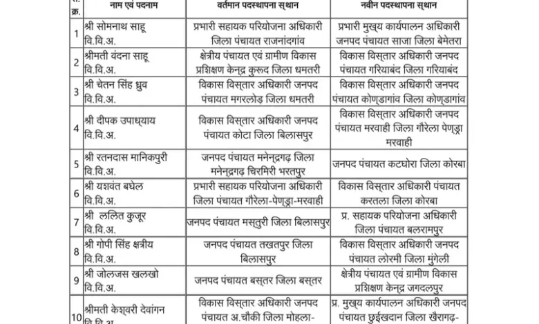 बता दें कि छत्तीसगढ़ शासन के पंचायत एवं ग्रामीण विकास विभाग मंत्रालय द्वारा बड़े पैमाने पर तबादला किए गए हैं। इन तबादलों से विकास विस्तार अधिकारी व सहायक परियोजना अधिकारियों की पदस्थापना में फेरबदल हुआ है।