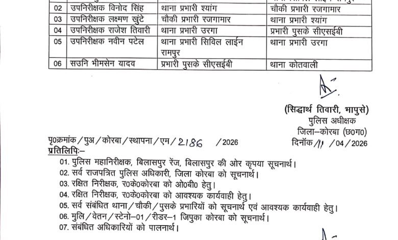 जारी आदेश के अनुसार, राजेश तिवारी को CSEB चौकी प्रभारी बनाया गया है, वहीं उरगा, सिविल लाइन रामपुर और अन्य महत्वपूर्ण थानों में भी नए प्रभारियों की नियुक्ति की गई है। पुलिस अधीक्षक ने सभी अधिकारियों को तत्काल प्रभाव से नए पदस्थापना स्थल पर कार्यभार ग्रहण करने के निर्देश दिए हैं।इस फेरबदल को जिले में कानून-व्यवस्था को और मजबूत करने की दिशा में अहम कदम माना जा रहा है। नए सेटअप के बाद अब पुलिसिंग में तेजी और सख्ती देखने की उम्मीद जताई जा रही है।