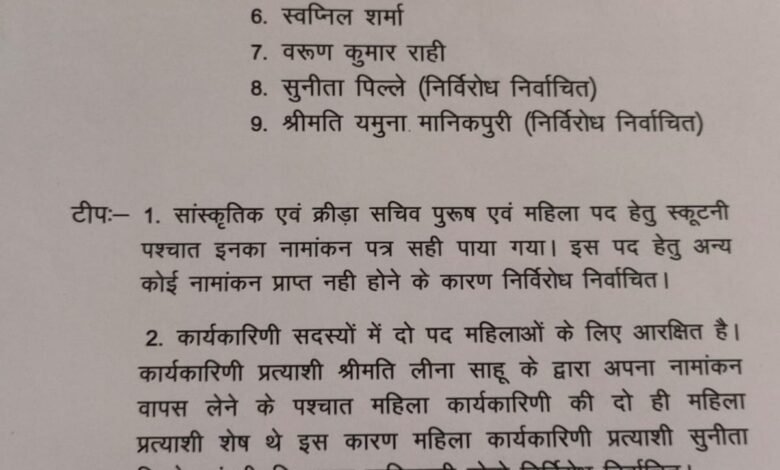 जानकारी के मुताबिक कार्यकारिणी में दो पद महिलाओं के लिए आरक्षित थे। शुरुआत में श्रीमती लीना साहू ने भी नामांकन दाखिल किया था, लेकिन नाम वापस लेने के बाद केवल दो ही महिला प्रत्याशी मैदान में बचीं। ऐसे में सुनीता पिल्ले और यमुना मानिकपुरी का निर्विरोध निर्वाचन तय हो गया।
