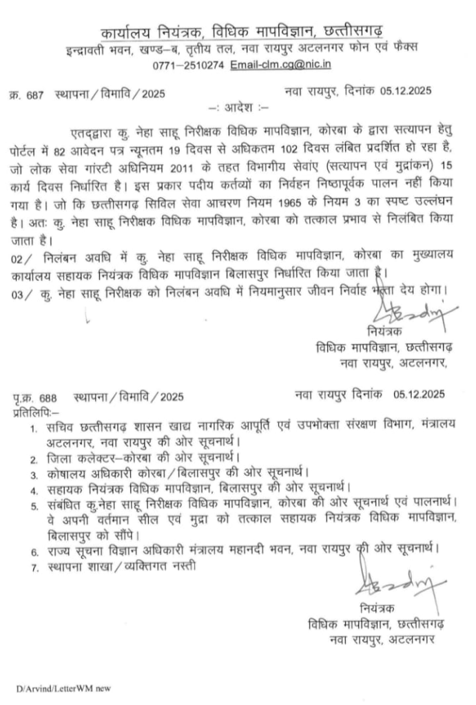कोरबा, 06 दिसंबर। legal Metrology Inspector : नियंत्रक, विधिक मापविज्ञान, छत्तीसगढ़ के आदेश के तहत, कोरबा में पदस्थ विधिक मापविज्ञान निरीक्षक कु. नेहा साहू को तत्काल प्रभाव से निलंबित कर दिया गया है। यह कार्रवाई उनके द्वारा कार्य में गंभीर लापरवाही बरतने और छत्तीसगढ़ सिविल सेवा आचरण नियम 1965 के नियम 3 के उल्लंघन के कारण की गई है।