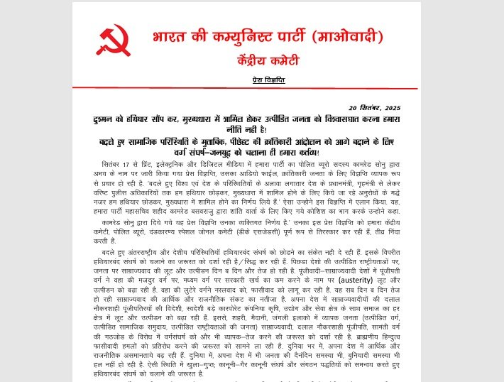 पार्टी ने यह भी स्पष्ट किया कि वह अब भी ‘शांति वार्ता’ के लिए तैयार है, बशर्ते केंद्र और राज्य सरकारें ईमानदारी से आगे आएं। इसके लिए नागरिक समाज से समर्थन जुटाने का आह्वान भी किया गया है।