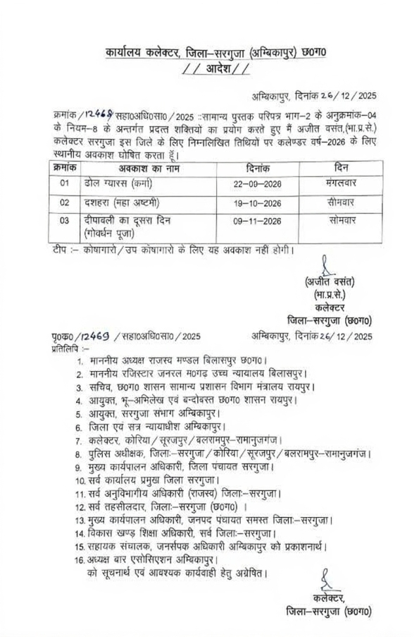 Local Holiday : 2026 कैलेंडर अपडेट…! तीन लोकल हॉलिडे तय…कलेक्टर अजीत वसंत ने जारी किया स्थानीय अवकाश का आदेश…यहां देखें