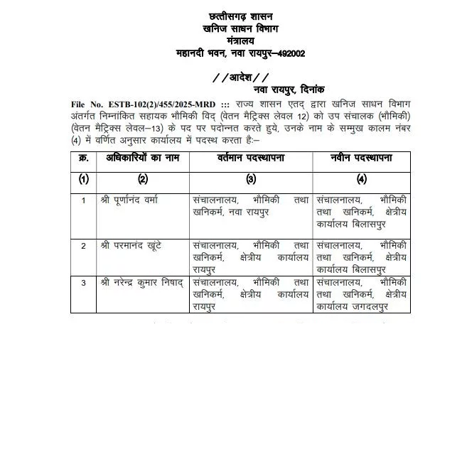 Mining Department : खनिज विभाग में 3 भौमिकीविदों को उप संचालक पद पर पदोन्नति…यहां देखें List
