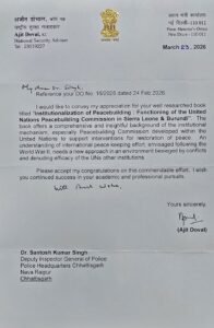 रायपुर।Ajit Doval राष्ट्रीय सुरक्षा सलाहकार अजीत डोभाल ने छत्तीसगढ़ पुलिस के उप महानिरीक्षक (DIG) डॉ संतोष कुमार सिंह द्वारा लिखित पुस्तक “Institutionalization of Peacebuilding: Functioning of the United Nations Peacebuilding Commission in Sierra Leone & Burundi” की सराहना करते हुए इसे गंभीर, विचारोत्तेजक और अत्यंत प्रासंगिक शोध बताया है।
