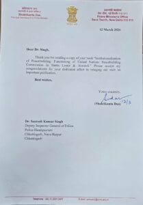उन्होंने डॉ. सिंह के इस महत्वपूर्ण प्रयास की सराहना करते हुए उन्हें बधाई दी और उनके शैक्षणिक व पेशेवर जीवन में निरंतर सफलता की कामना की। उल्लेखनीय है कि इससे पहले प्रधानमंत्री कार्यालय के प्रधान सचिव-2 Shaktikanta Das भी इस पुस्तक की प्रशंसा कर चुके हैं। लगातार मिल रही इस सराहना ने डॉ. संतोष सिंह के शोध कार्य को राष्ट्रीय स्तर पर विशेष पहचान दिलाई है, जो न केवल उनके लिए, बल्कि पूरे छत्तीसगढ़ के लिए गर्व का विषय बन गया है।