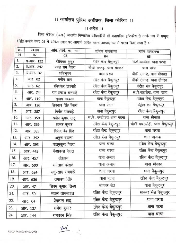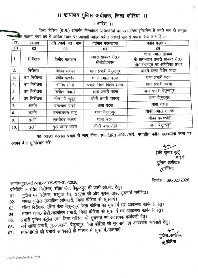 कोरिया, 10 फरवरी। Police Transfer : छत्तीसगढ़ के कोरिया जिले के पुलिस विभाग में बड़े पैमाने पर तबादले किए गए हैं। प्रशासनिक कसावट और पुलिसिंग को और मजबूत करने के उद्देश्य से पुलिस अधीक्षक रवि कुमार कुर्रे ने तबादला आदेश जारी किया है।