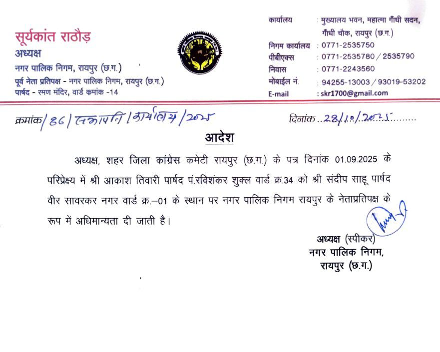 RPR Municipal Corporation : रायपुर नगर निगम से बड़ी खबर…! आकाश तिवारी बने नगर निगम नेता प्रतिपक्ष…यहां देखें आदेश कॉपी
