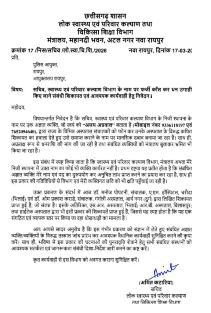 रायपुर, 02 मार्च। Scam Alert : छत्तीसगढ़ में स्वास्थ्य विभाग से जुड़ा एक बड़ा ठगी का मामला सामने आया है। अमित कटारिया (स्वास्थ्य सचिव) के नाम का सहारा लेकर एक शख्स खुद को उनका करीबी बताकर अस्पताल संचालकों से पैसों की मांग कर रहा है। मामला बढ़ने पर सचिव ने पुलिस में शिकायत दर्ज कराने की पहल की है।