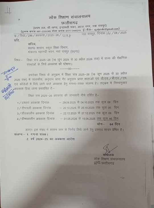 रायपुर, 19 सितंबर। School Holidays Declared : छत्तीसगढ़ के स्कूलों में पढ़ने वाले विद्यार्थियों के लिए बड़ी राहत की खबर है। इस साल दशहरा, दीपावली, शीतकालीन और ग्रीष्मकालीन अवकाश को मिलाकर कुल 64 दिनों की छुट्टियां मिलने जा रही हैं। हालांकि शिक्षा विभाग की ओर से आधिकारिक आदेश फिलहाल जारी नहीं हुआ है, लेकिन सूत्रों के मुताबिक, डीपीआई (लोक शिक्षण संचालनालय) के प्रस्ताव पर शिक्षा विभाग ने अपनी सहमति दे दी है।