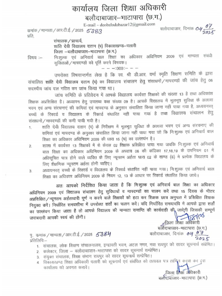 School Identity Cancelled : बलौदाबाजार से बड़ी खबर…! छात्रा से छेड़छाड़ के आरोपी शिक्षक पर कार्रवाई…शाश्वत लिटिल स्टार स्कूल की मान्यता रद्द…4 अन्य स्कूलों को नोटिस