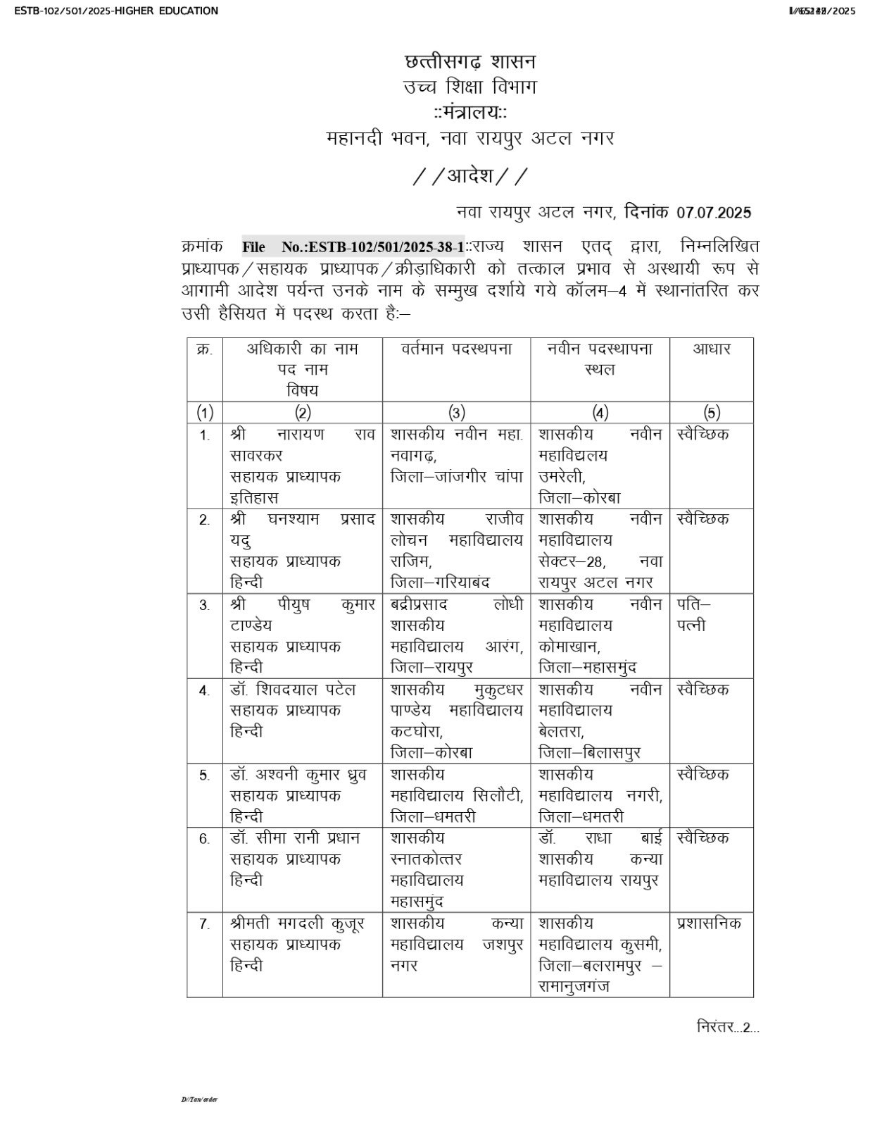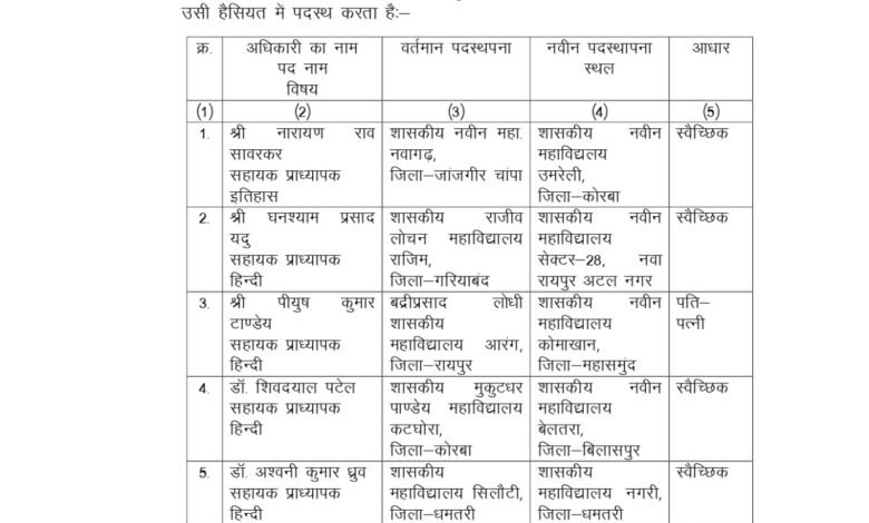 CG Transfer: रायपुर । उच्च शिक्षा विभाग ने यूजी पीजी कालेज के पांच दर्जन, प्राध्यापक, सहायक प्राध्यापक और क्रीड़ाधिकारियों के तबादले किए हैं।