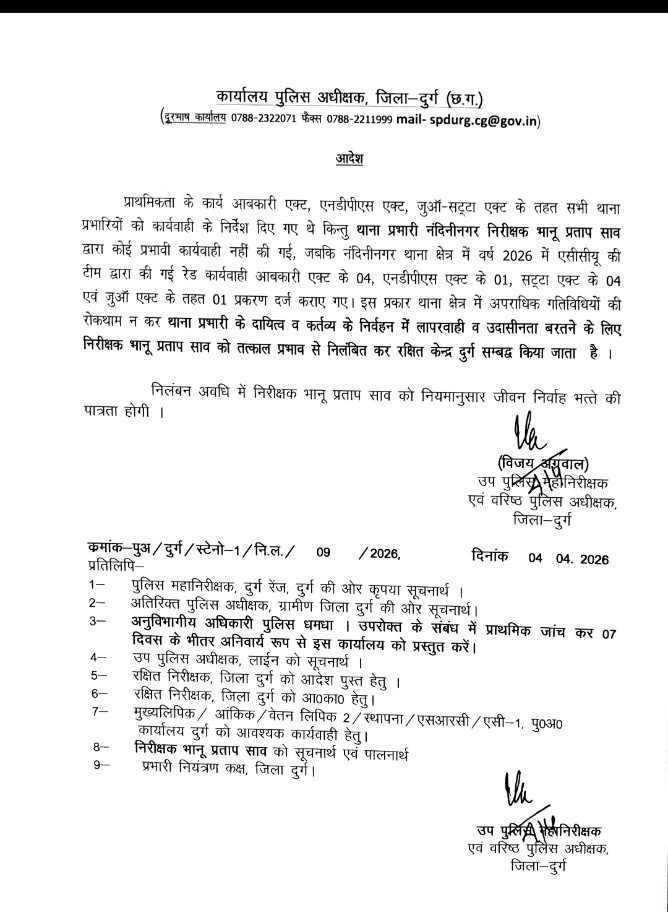 दुर्ग, 05 अप्रैल। SSP Strict Action : दुर्ग जिले के नंदिनी थाना प्रभारी निरीक्षक (TI) भानुप्रताप साव को सस्पेंड कर दिया गया है। यह कार्रवाई जिला पुलिस मुखिया वरिष्ठ पुलिस अधीक्षक (SSP) विजय अग्रवाल द्वारा की गई है।