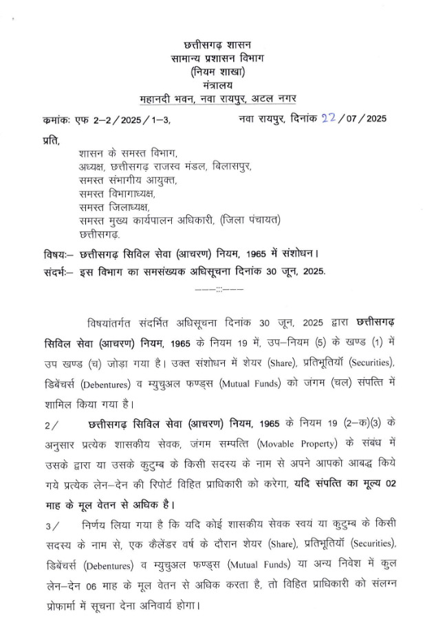 30 जून 2025 को जारी अधिसूचना के तहत, सरकार ने शेयर, प्रतिभूतियां, डिबेंचर्स और म्युचुअल फंड्स को “जंगम संपत्ति” की श्रेणी में शामिल कर दिया है। छत्तीसगढ़ सिविल सेवा (आचरण) नियम, 1965 के नियम 19 में किए गए संशोधन के अनुसार: