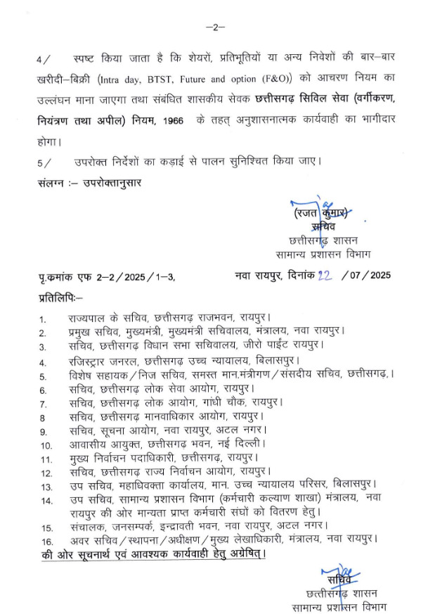 रायपुर, 25 जुलाई। Share Trading : छत्तीसगढ़ सरकार ने शासकीय सेवकों की शेयर बाजारमें बढ़ती सक्रियता पर सख्त रुख अपनाते हुए शेयर ट्रेडिंग और निवेश को लेकर कड़ा आदेश जारी किया है। सामान्य प्रशासन विभाग (GAD) की ओर से सभी विभाग प्रमुखों, कलेक्टरों, जिला पंचायत सीईओ और अन्य अधिकारियों को भेजे गए पत्र में स्पष्ट किया गया है कि बार-बार शेयरों की खरीद-बिक्री को सिविल सेवा आचरण का उल्लंघन माना जाएगा।