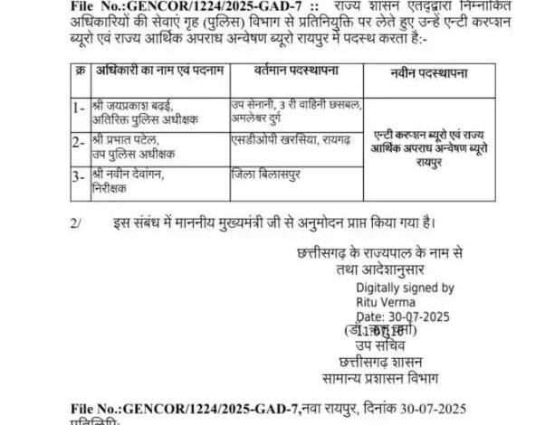 रायपुर, 30 जुलाई 2025 |छत्तीसगढ़ में भ्रष्टाचार निरोधक ब्यूरो (ACB) और आर्थिक अपराध अन्वेषण शाखा (EOW) को और अधिक सशक्त करने की दिशा में सरकार ने एक महत्वपूर्ण कदम उठाया है। तीन पुलिस अधिकारियों को प्रतिनियुक्ति पर ACB-EOW में पदस्थ करने का आदेश राज्य सरकार द्वारा जारी किया गया है।