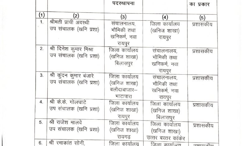 Breaking: माइनिंग डिपार्टमेंट के 9 अफसरो का तबादला.. रमाकांत सोनी गए रायगढ़…
