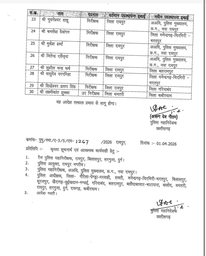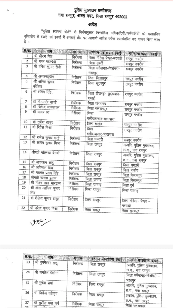 रायपुर, 01 मार्च। TI-SI Transfers in CG : पुलिस मुख्यालय ने बड़ा प्रशासनिक फेरबदल करते हुए 30 पुलिसकर्मियों के ट्रांसफर के आदेश जारी किए हैं। इस सूची में 29 थाना प्रभारी (TI) और 1 सब-इंस्पेक्टर (SI) शामिल हैं।