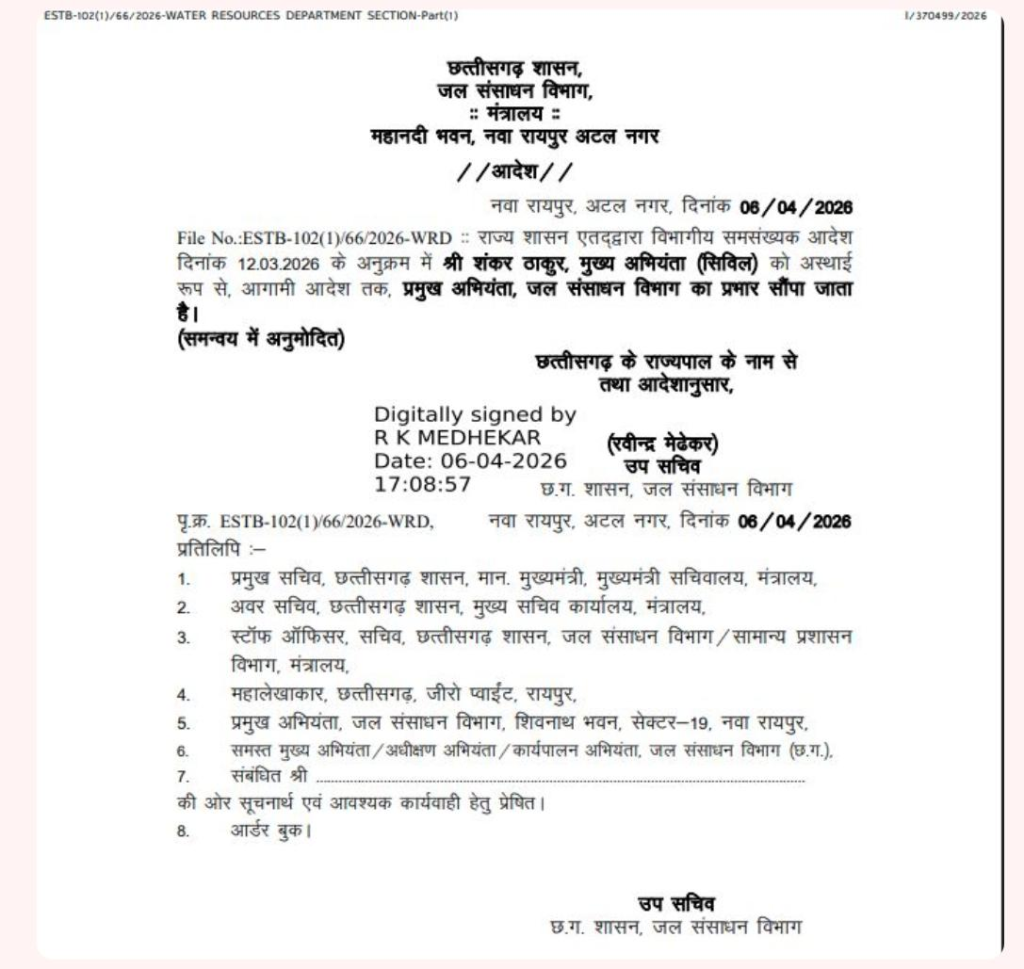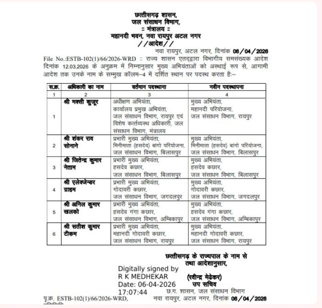 रायपुर, 07 अप्रैल। Transfer Breaking : छत्तीसगढ़ के जल संसाधन विभाग में बड़ा प्रशासनिक फेरबदल किया गया है। शासन द्वारा जारी आदेश के तहत विभाग में कई वरिष्ठ अधिकारियों को नई जिम्मेदारियां सौंपी गई हैं, जिससे विभागीय कार्यप्रणाली में तेजी और प्रभावशीलता लाने की कोशिश की गई है।