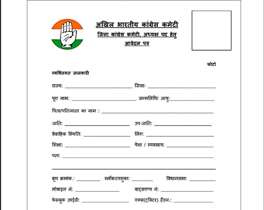 आवेदन पत्र में सबसे पहले आपकी व्यक्तिगत जानकारी और सभी सोशल मीडिया हैंडल (व्हाट्सएप, फेसबुक, एक्स आदि) की जानकारी मांगी जाती है। इसके बाद, आप कांग्रेस पार्टी में कब से सक्रिय हैं? आपने अपना पहला पद कब संभाला था और वर्तमान में आपका क्या पद है? अब तक के सभी पदों का वर्षवार विवरण। क्या आपको किसी सरकारी पद के लिए नामांकित किया गया है? यदि आपने चुनाव लड़ा है, तो किस वर्ष, किस पद के लिए, परिणाम क्या रहे और आपका वोट प्रतिशत कितना रहा?